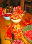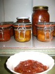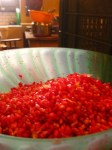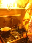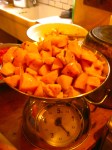 9. Suzie brought down two large baskets of quinces. Quinces are a sort of cross between a pear and an apple, and they smell wonderful and sweet. For those of you in DC/Georgetown/Bethesda, Dolcezza gelateria offers quince gelato. You should try it, it’s really good :). You don’t really eat quinces raw, they’re too tough. So you cook them into things like gelato, or in our case, jam. Now, when making jams, you need to know how much pectin the fruit you are using has. Green apples produce a lot of pectin when cooked down, so they are a good natural thing to add to other lower pectin fruits, when making jam. Or, you could buy pectin packets, and they will tell you on the box how much you need for certain fruits. Quinces are similar to green apples in that they have enough pectin naturally, so you don’t need to add any to make jam. I’m just saying pectin and assuming everyone knows its role, but if you don’t, pectin is the gel bit that forms when you boil fruit and sugar (and a bit of water) down – it thickens the mixture and solidifies when it cools. So we chopped up the quince into medium sized chunks and cooked it in a pressure cooker with a cup of water until it softened. Then we weighed it and put it with half its weight in sugar, and a bit of water, into a large pot and cooked it down. It became this beautiful caramel color and there were still chunks of quince as we spooned it into jars. So pretty. There are pictures :). I should also note that the jars have to be sterilized, which you do by boiling a pot of water and submerging the jars in the boiled water for 10 minutes. Then you let them dry and, HEY, you have sterilized jars.